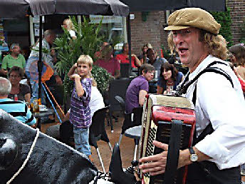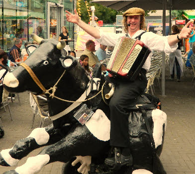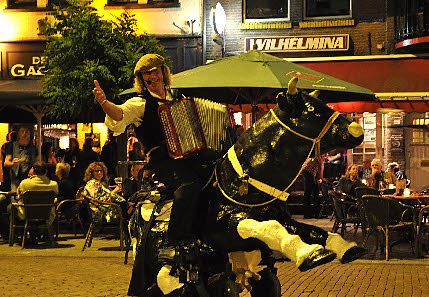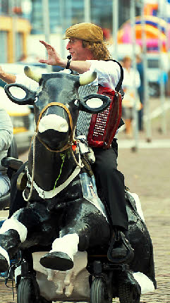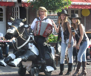 Op woensdag hobbelde er een opmerkelijk voertuig over de Julianastraat: een koe op vier wielen. Erop zat een accordeonist, die bekende liedjes ter plekke aan paste aan de omstandigheden.