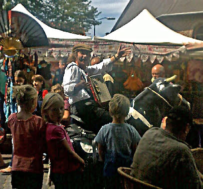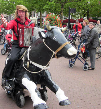 Hij speelt accordeon en zingt terwijl hij rondrijdt op een gemotoriseerde plastic koe. Tja…